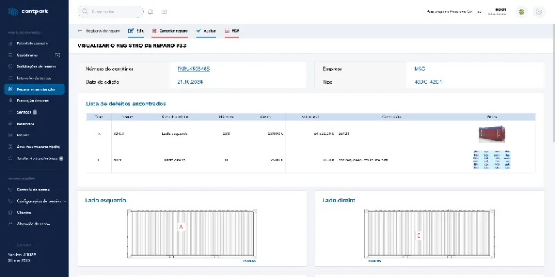 Nosso recurso de Controle de Condição de Contêiner permite que o criador de uma declaração de reparo imprima uma declaração de condição. Na conta pessoal do proprietário do software, ele pode ver dados sobre cada defeito no equipamento, aceitar ou recusar um reparo.